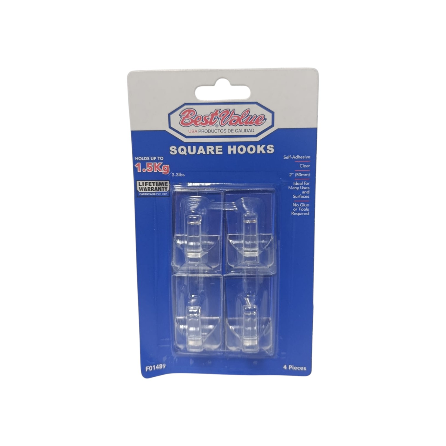 GANCHO ADHESIVO BEST VALUE CUADRADO TRANSPARENTE 50 MM 4 UND